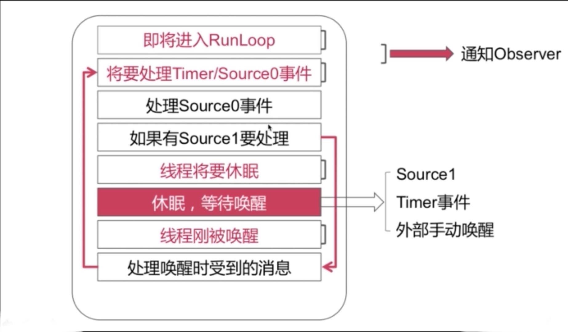 大概说一下,在runloop开启的时候会发出kCFRunLoopEntry通知,告知即将进去RunLoop。那一启动就相当于进入了用户态的模式,所以优先处理Timer事件,如果有标记过的source0事件那就接着处理source0事件,如果有source1事件(也就是唤醒时收到的消息)那就处理source1事件,如果没有source1事件,那就会发出beforWaiting通知进入休眠状态。在休眠期间如果收到了Timer、source1、外部手动唤醒等事件,则runloop又会被唤醒。